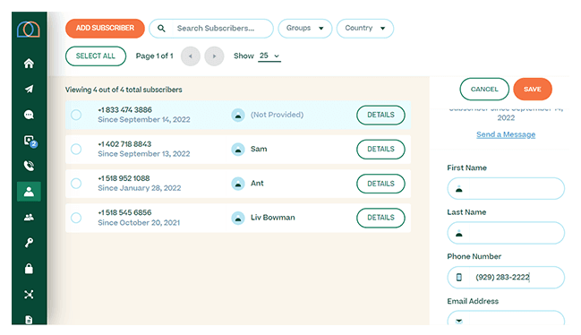 Adding in contacts manually via the online control panel (or mobile app) is easy-peasy. All it takes is the click of a button, typing in information for the subscriber, and clicking “Save.”